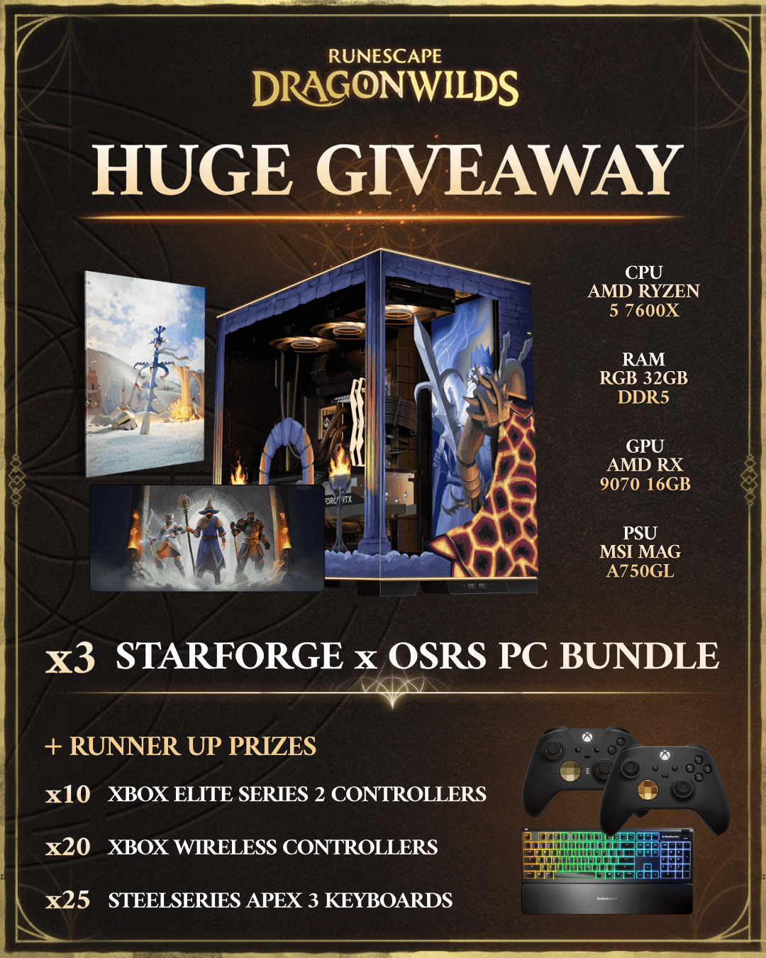 We're giving away THREE Starforge PCs with iconic RuneScape visuals, as well as a ton of cool hardware including Xbox Elite Controllers for you to use when you jump into Ashenfall in RuneScape: Dragonwilds!